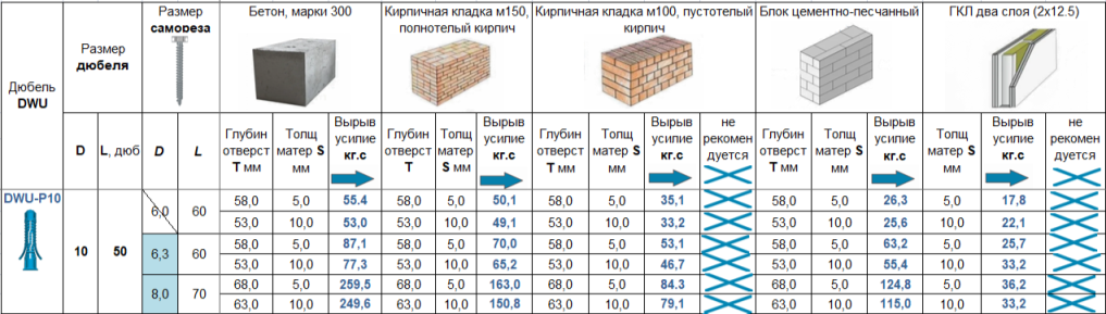 Нагрузка на вырывание. Величину нагрузок на вырывание по дюбелям компании INTEH можно найти в разделе «Техническая информация» главного меню сайта или перейти по данной ссылке. Величину нагрузок по изделию DWU-P10 можно найти на данной странице.