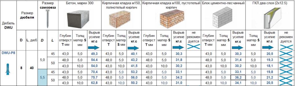 Нагрузка на вырывание. Величину нагрузок на вырывание по дюбелям компании INTEH можно найти в разделе «Техническая информация» главного меню сайта или перейти по данной ссылке. Величину нагрузок по изделию DWU-P8 можно найти на данной странице.