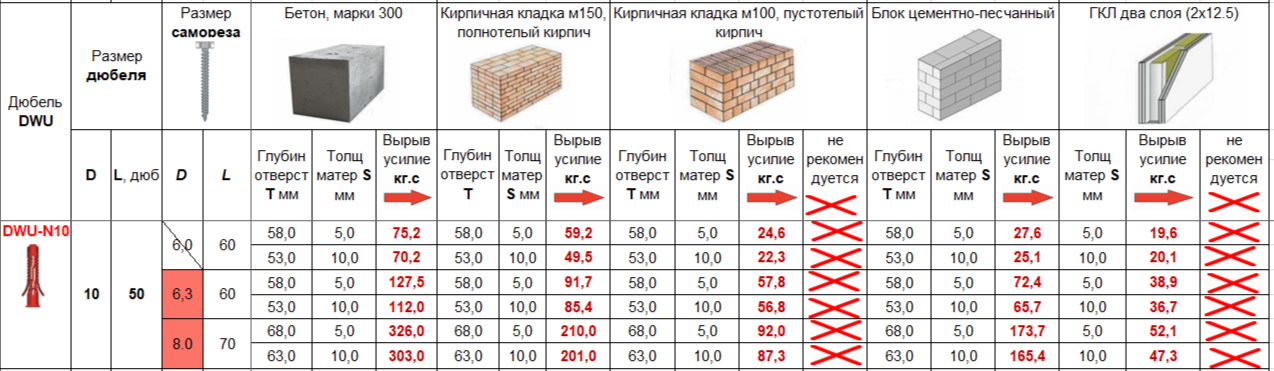 Нагрузка на вырывание. Величину нагрузок на вырывание по дюбелям компании INTEH можно найти в разделе «Техническая информация» главного меню сайта или перейти по данной ссылке. Величину нагрузок по изделию DWU-N10 можно найти на данной странице во вкладке «Характеристики».
