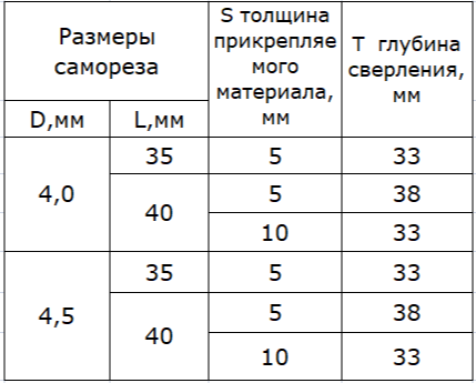 Рекомендуемые глубина сверления зависит от толщины прикрепляемого материала и размеров используемого самореза: