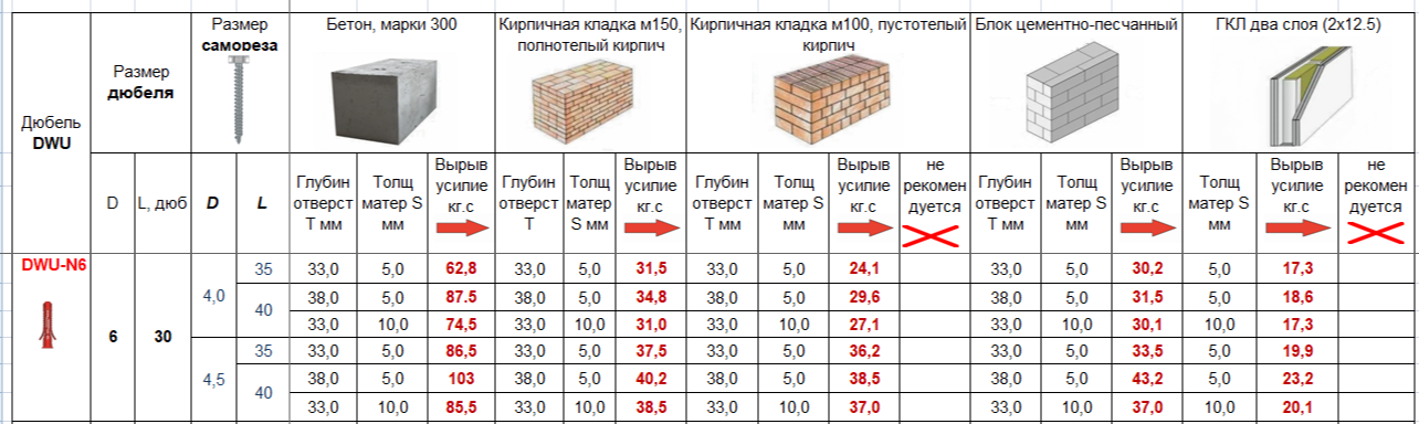Нагрузка на вырывание. Величину нагрузок на вырывание по дюбелям компании INTEH можно найти в разделе «Техническая информация» главного меню сайта или перейти по данной ссылке. Величину нагрузок по изделию DWU-N6 можно найти на данной странице во вкладке «Характеристики».