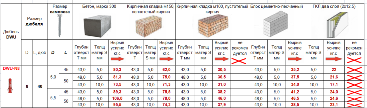 Нагрузка на вырывание. Величину нагрузок на вырывание по дюбелям компании INTEH можно найти в разделе «Техническая информация» главного меню сайта или перейти по данной ссылке. Величину нагрузок по изделию DWU-N8 можно найти на данной странице во вкладке «Характеристики».