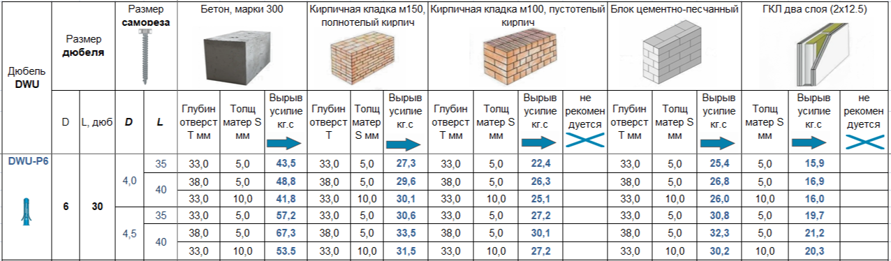 Нагрузка на вырывание. Величину нагрузок на вырывание по дюбелям компании INTEH можно найти в разделе «Техническая информация» главного меню сайта или перейти по данной ссылке. Величину нагрузок по изделию DWU-P6 можно найти на данной странице во вкладке «Информация».