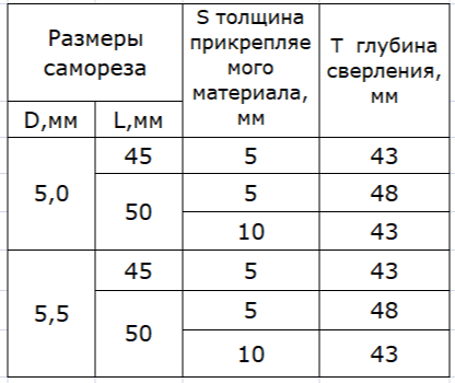 При использовании рекомендованных размеров самореза составляет: