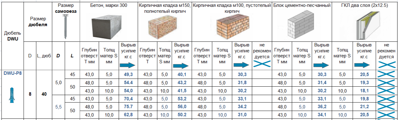 Нагрузка на вырывание. Величину нагрузок на вырывание по дюбелям компании INTEH можно найти в разделе «Техническая информация» главного меню сайта или перейти по данной ссылке. Величину нагрузок по изделию DWU-P8 можно найти на данной странице во вкладке «Информация».